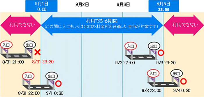 ※本プランのご利用日は、入口料金所もしくは出口料金所(本線料金所、フリーフローアンテナ含む)の通過時刻で判定いたします。