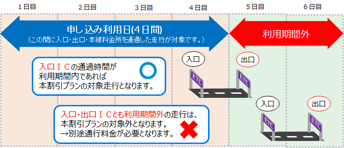 なお、本割引プランの適用対象外となる走行分については、別途その走行にかかる通行料金のお支払いが必要となりますのでご注意ください。 」